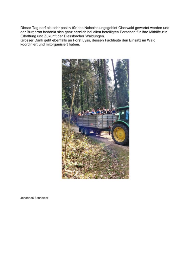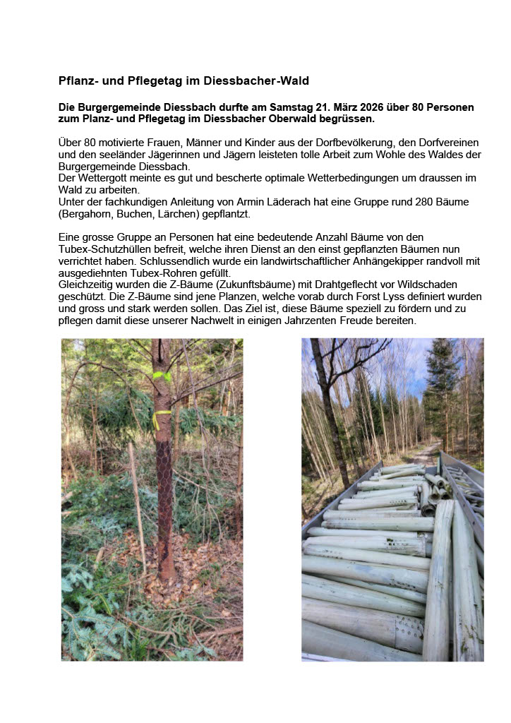 Aufgeteilt in verschiedene Gruppen, welche je von einer Fachkraft des Forst Lyss geleitet wurde, fanden die Pflanz- und Pflegeeinsätze an verschiedenen Standorten statt. Um die 60 Helferinnen und Helfer durfte Burgerpräsident Ernst Häni begrüssen. Nebst den Diessbacher-Landwirten konnten auch Burgerinnen und Burger, eine Delegation von Jägerinnen und Jäger, Familien mit Kindern und verschiedene Vereinsmitglieder begrüsst werden.