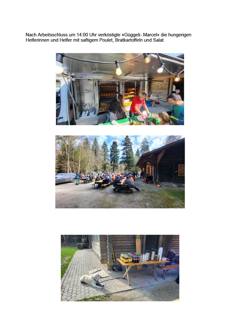 Die Helferinnen und Helfer wurden vom Küchenteam, unter der Leitung von Carmen Rufer, grosszügig verpflegt. Nebst einem deftigen Znüni gab es nach dem Arbeitseinsatz, im gemütlich eingeheizten Waldhaus, ein feines Mittagessen.
