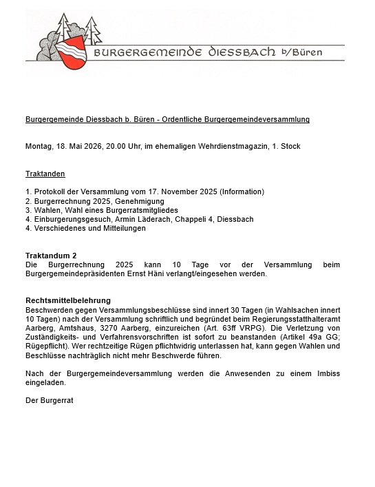 Alle stimmberechtigten Burgerinnen und Burger von Diessbach b.B. sind herzlich willkommen.